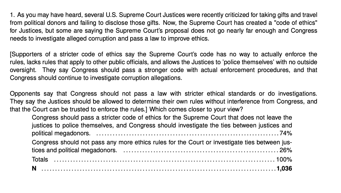 WASHINGTON, DC— A new poll released Tuesday shows that even after learning that the Supreme Court has instituted a ‘code of ethics’ for itself, the overwhelming majority of Americans support Congress passing tougher ethics rules and investigating ties between justices and political megadonors.